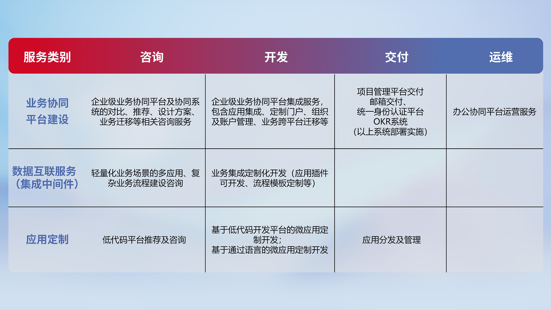 针对钉钉、、、企微、、IDaas等平台级产品提供产品的规划、、、方案、、、交付、、、定制化开发等服务,,实现如统一协同办公、、、、智能客户服务、、、混合会议管理、、、、智能数据查询、、、等业务场景,,实现数字化转型。。。。