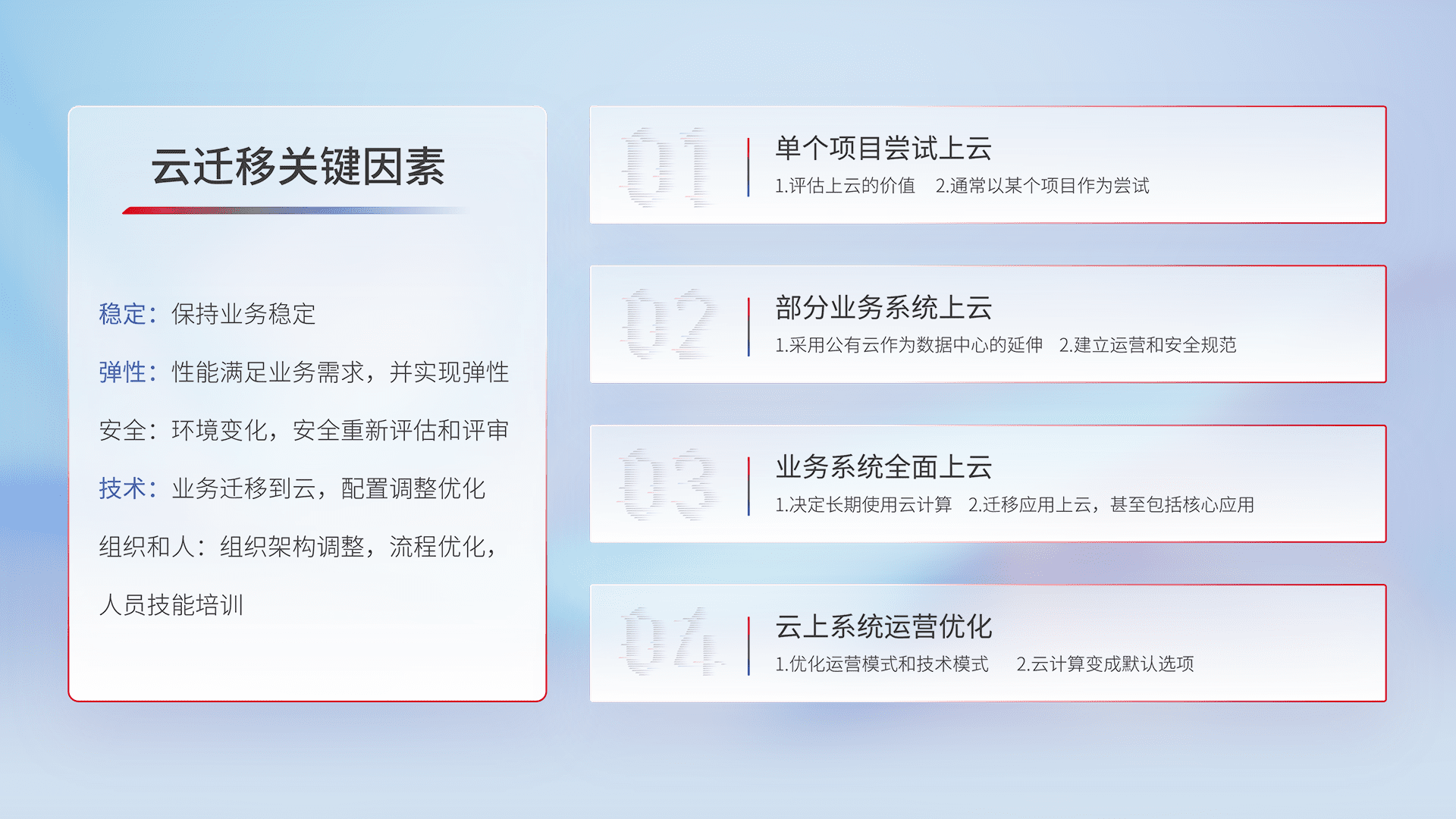 结合实际业务,,,,从规划设计、、、、云平台选型、、、云原生改造、、数据迁移、、、、集成交付,,,迁移全过程为客户识别最佳上云路径,,做好风险识别管理,,,,设计网络架构、、身份权限、、、、安全审计合规、、操作审计、、日志审计、、、监控告警策略、、、多站点容灾设计等,,,,对云上基础设施进行整体规划,,提升IT治理水平,,,以满足弹性、、高可用、、、、高性能的需求。。
