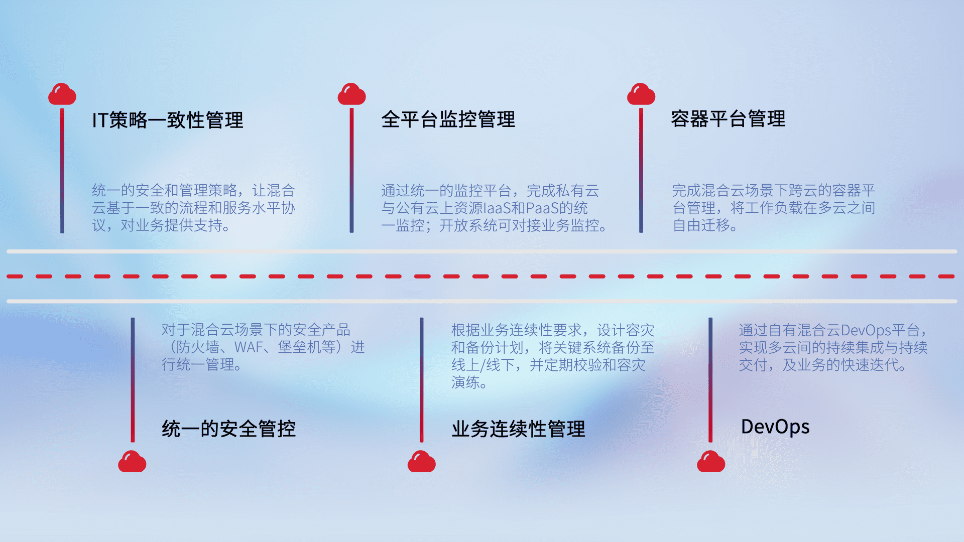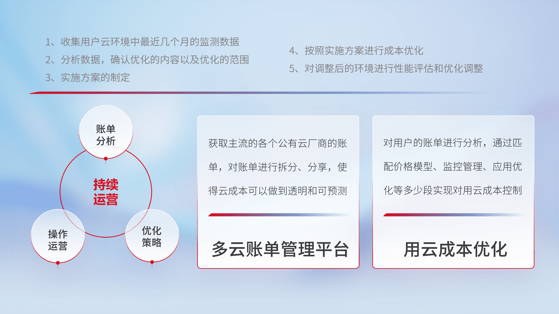 通过多云纳管,,,以统一的资源数据模型把客户的云资源进行抽象和封装,,,进而实现对多云资源的统一操作,,,保障云资源管理的可靠性、、、、稳定性与可用性。。量身定制化运维内容,,,配置、、、开发运维、、、、补丁管理、、备份、、、监控、、认证和访问管理、、、、审计和日常巡检等,,保障在用云过程中的可靠度,,稳定度以及高可用率。。